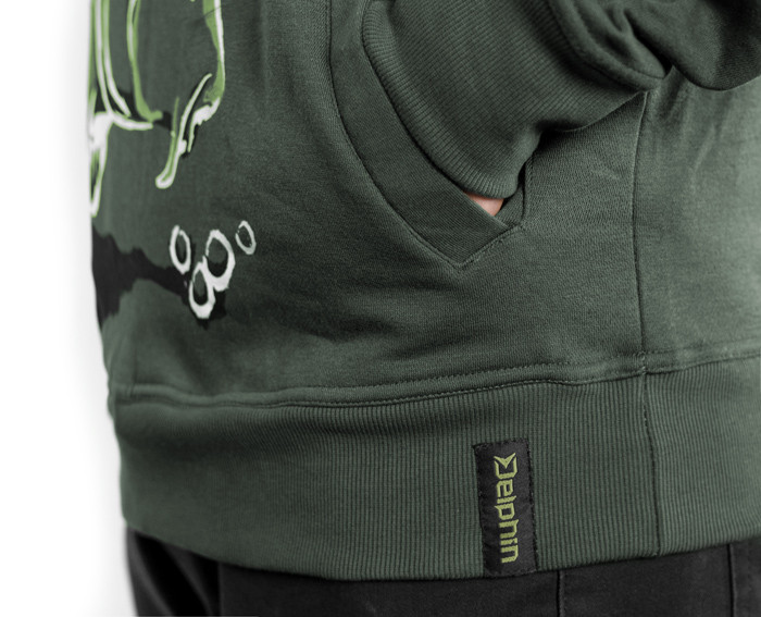 Maľba kapra prechádza dookola celého trupu v jeho spodnej časti. Kapor je zobrazený ako skica, či maľba pri zachovaní všetkých dôležitých detailov. Ryba je zachytená v situácii, kedy sa blíži k hrsti boilies, čo je práve ten moment, na ktorý všetci na brehu čakáme. Samotná mikina je vysokej kvality, rovnako ako použitá farebná tlač.